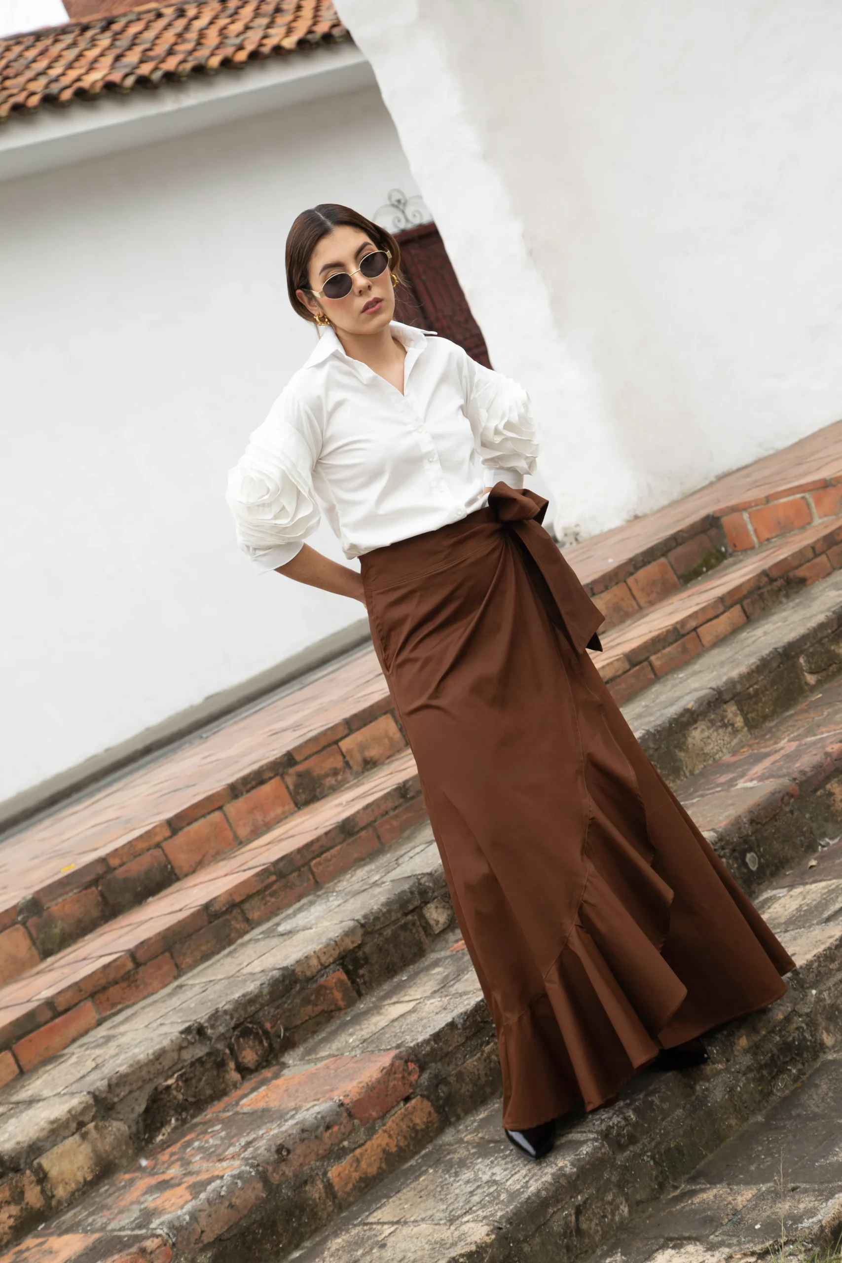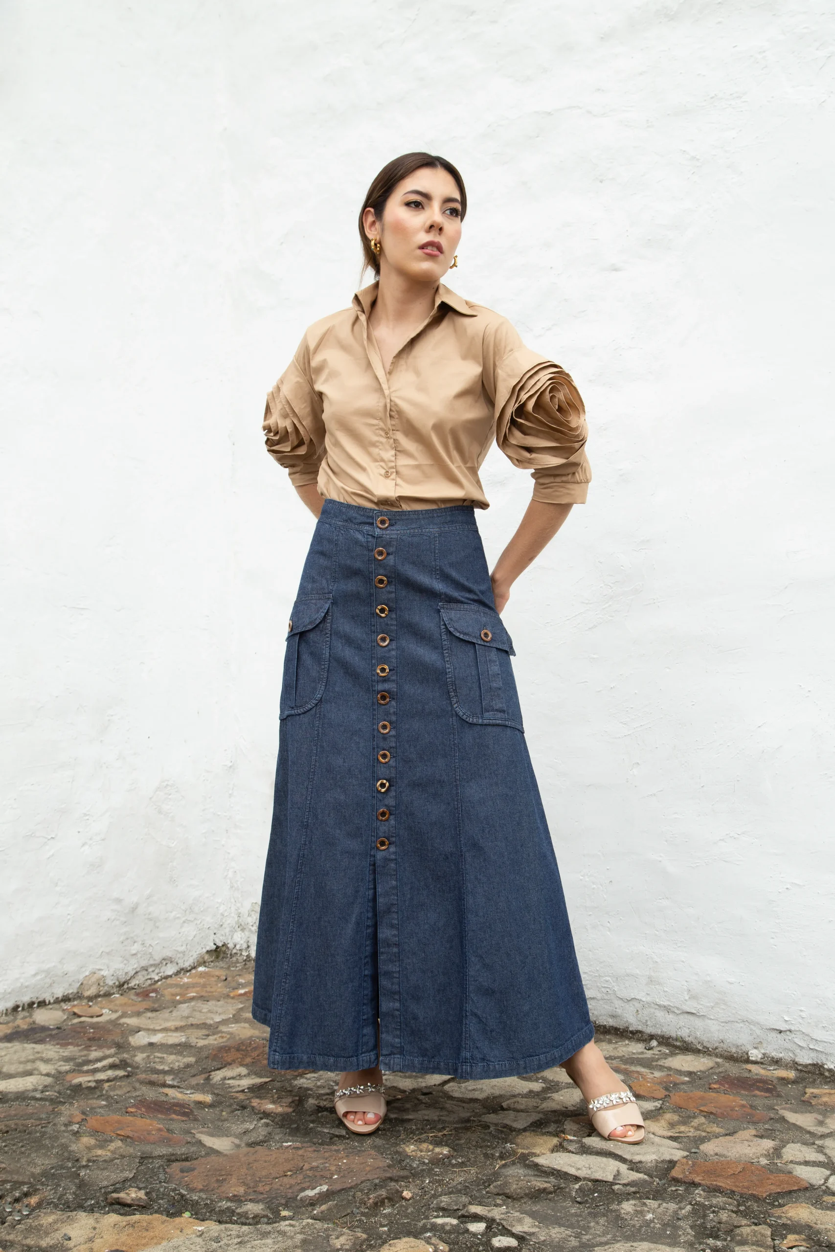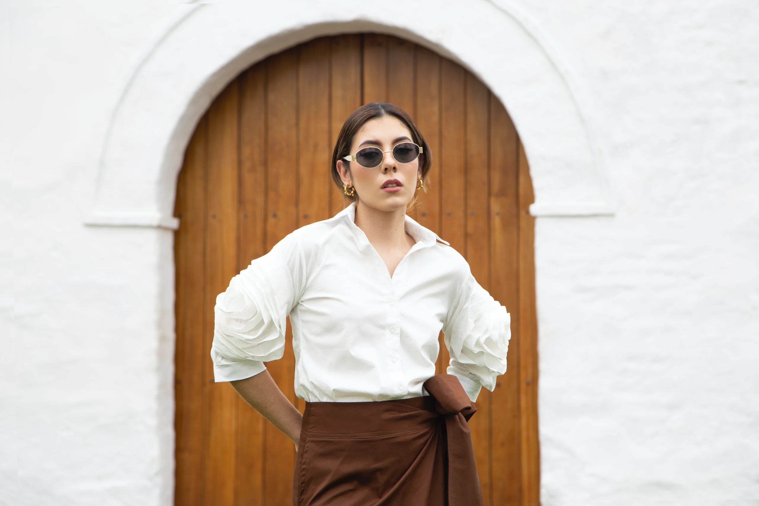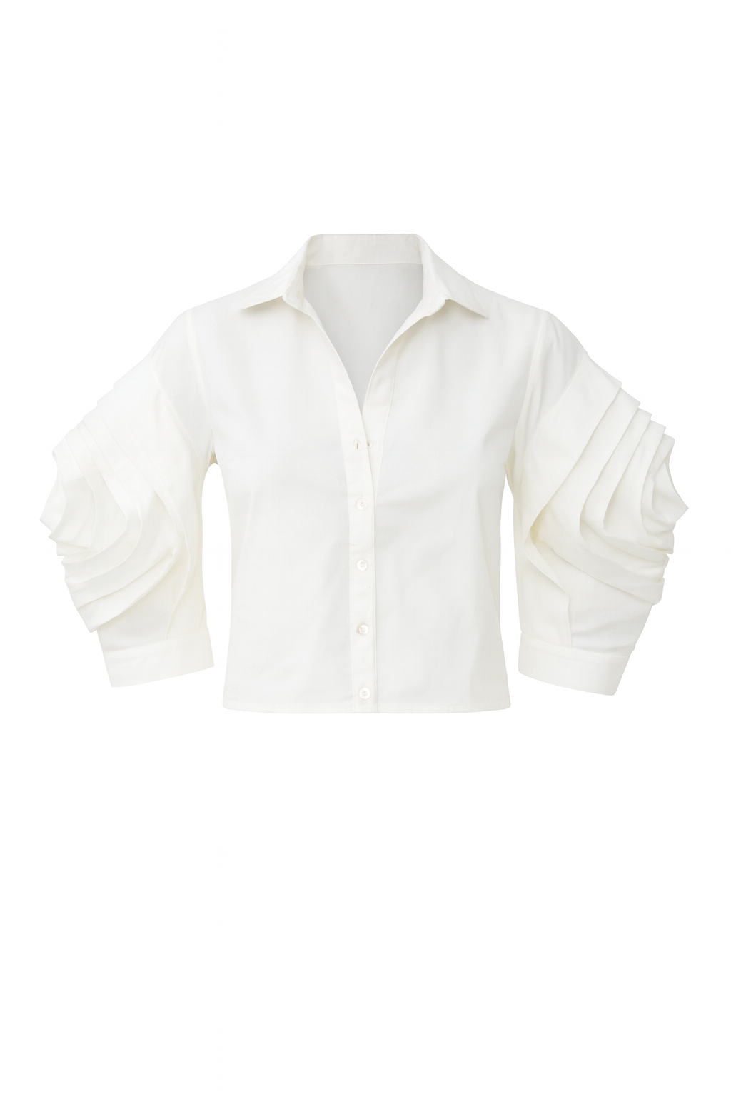 La Camisa Flor de Mármol es una declaración de sofisticación pura. Su silueta clásica se eleva con mangas escultóricas que evocan pliegues arquitectónicos, creando un juego de volumen en forma de flor que habla de poder, elegancia y una feminidad segura de sí misma.