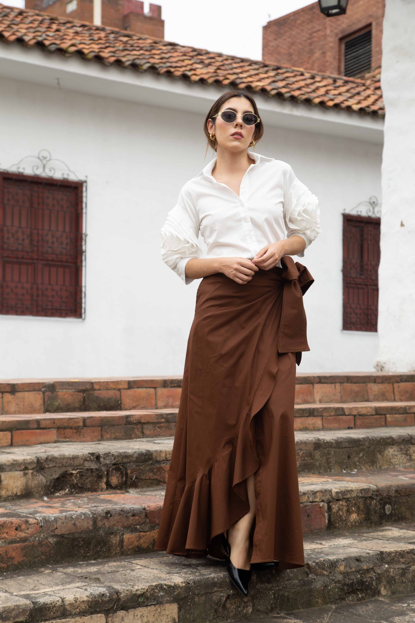 El tono café profundo, cálido y ultra chic, aporta una sensación de lujo atemporal, mientras los volantes asimétricos añaden un dramatismo medido, sofisticado y absolutamente moderno.