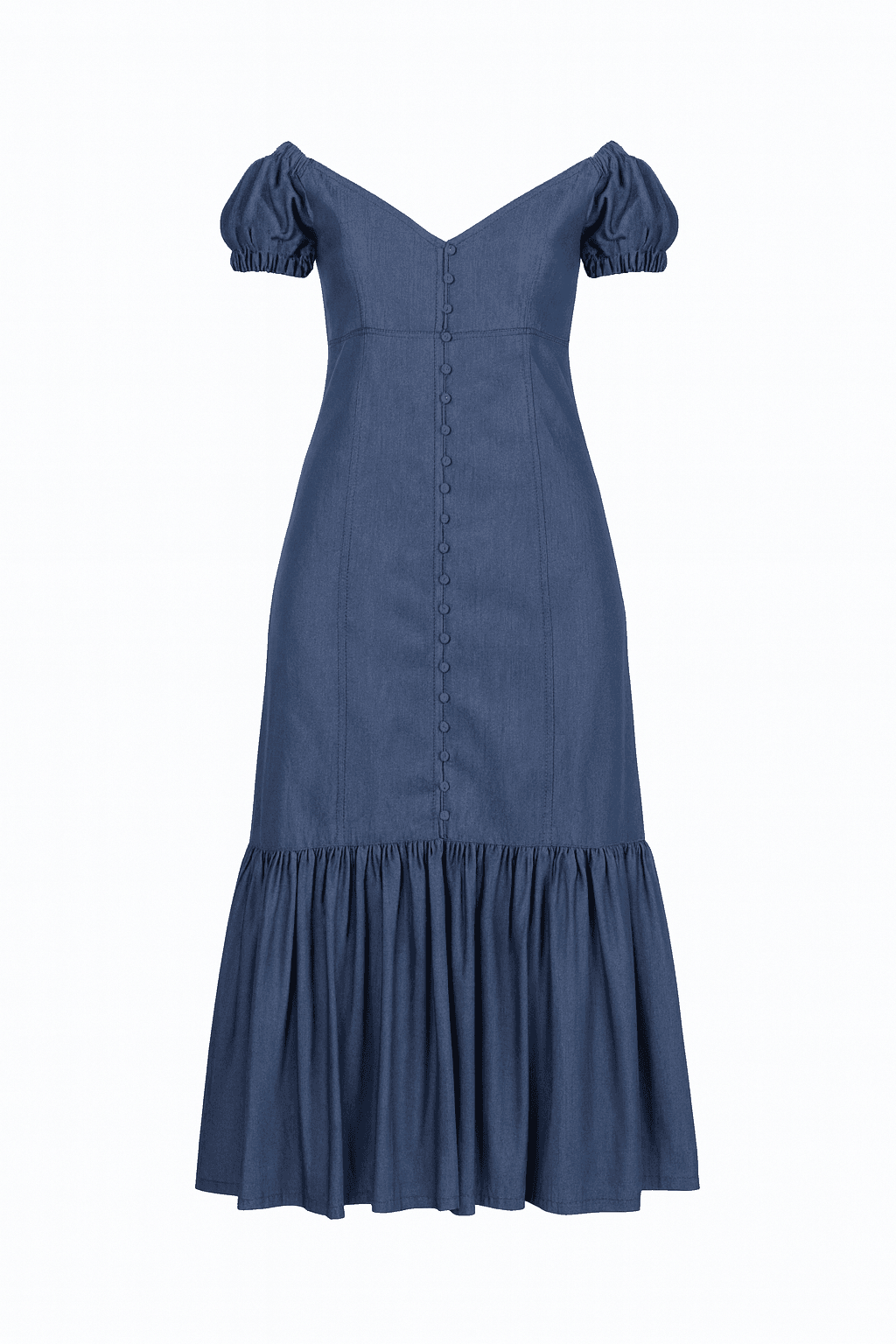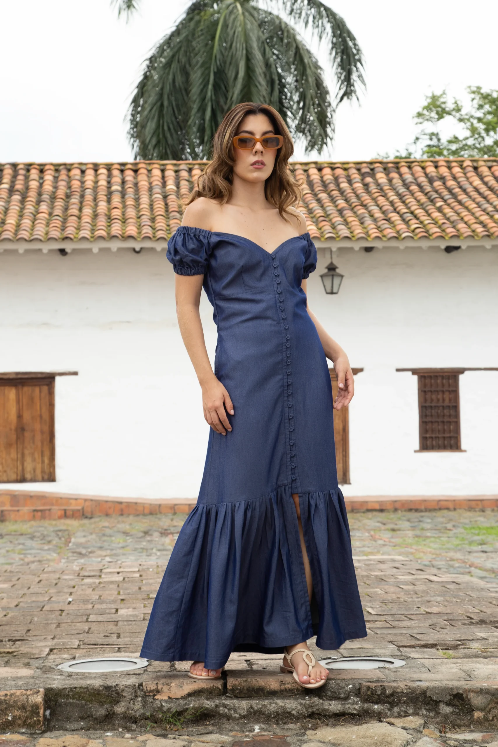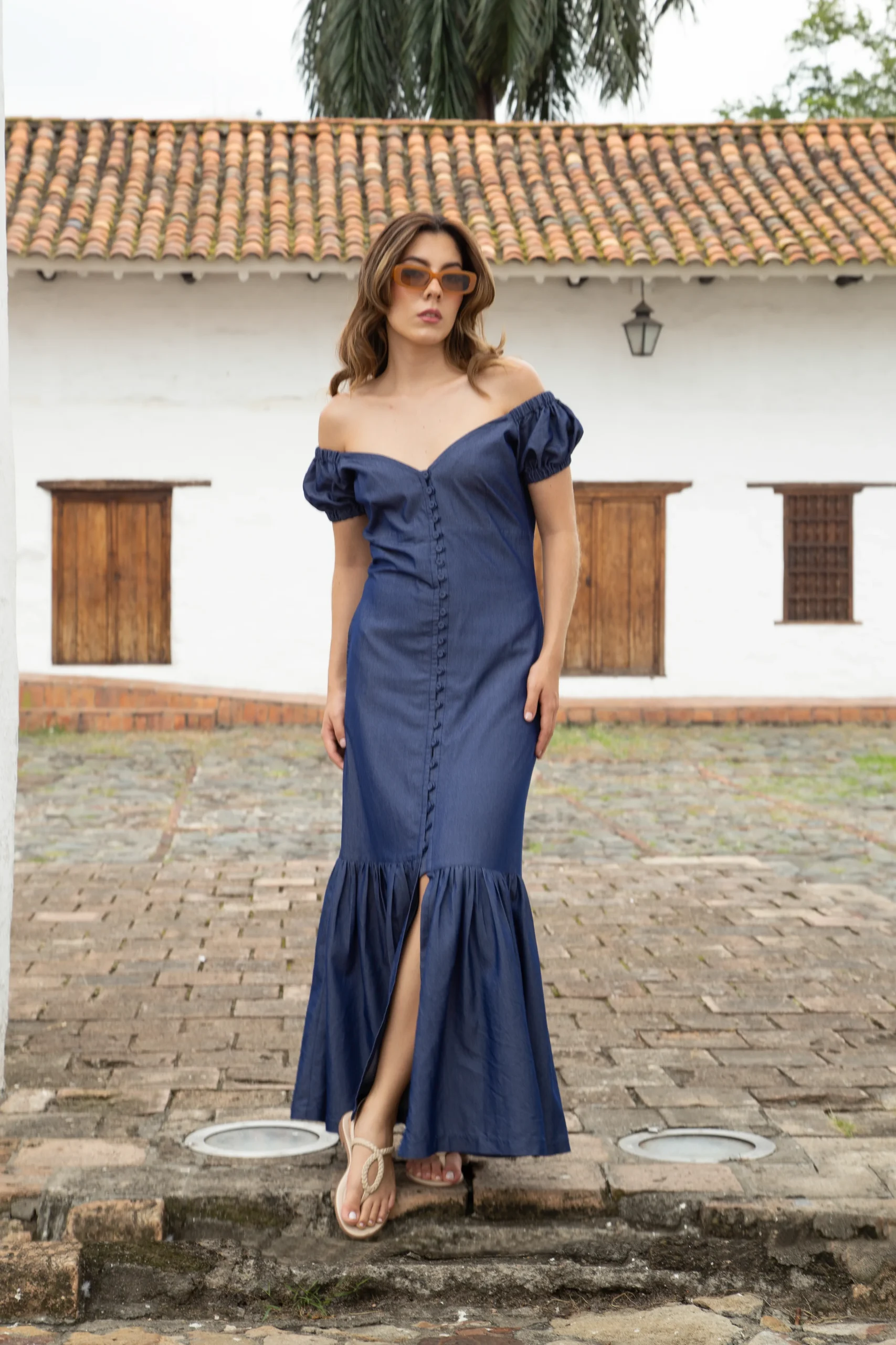 Un diseño que se mueve entre la delicadeza y la fuerza, pensado para la mujer que deja huella sin necesidad de alzar la voz. Su escote sutilmente caído enmarca los hombros con una sensualidad elegante, mientras los botones forrados y la falda amplia en volantes crean una caída impecable que acompaña cada paso con gracia.
